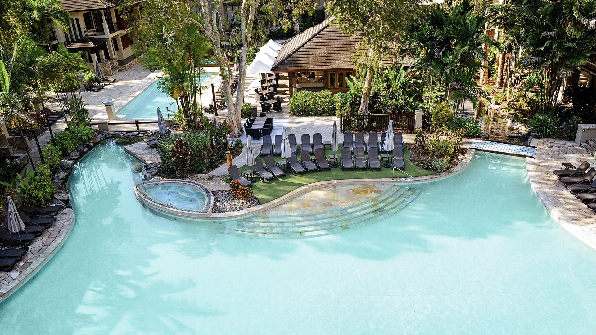 View Deal →Coastal Chic Palm Cove Haven Overlooking the Beach with Lagoon-Style Pool, Swim-Up Bar & Restaurant